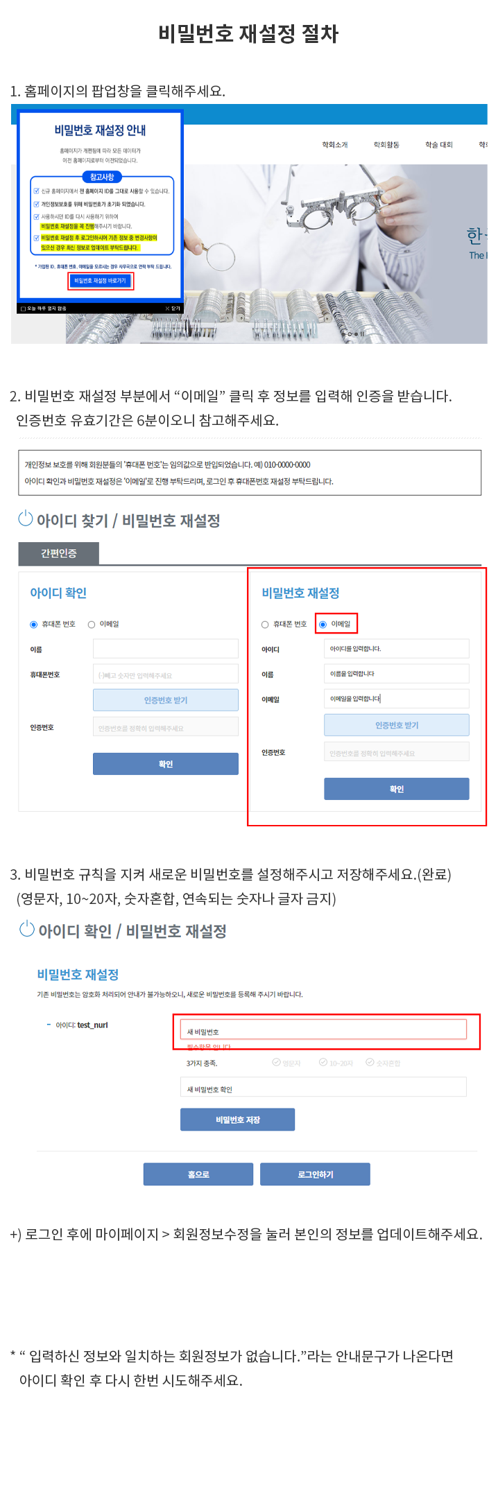 * 아래 안내드린 방법대로 우선 진행 후에도 재설정이 되지 않을 땐 학회 사무국으로 문의 부탁드립니다.