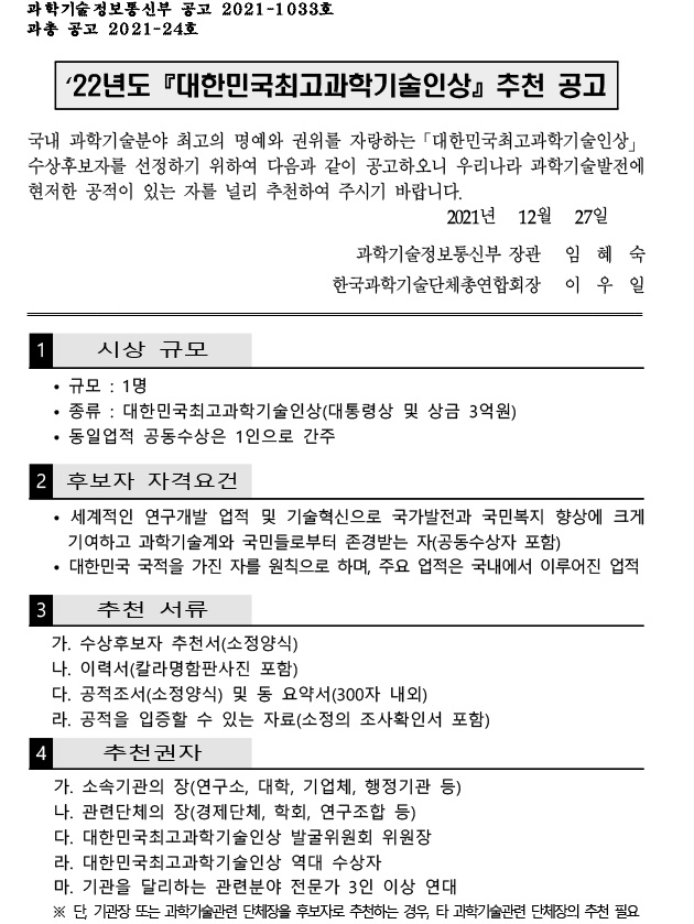 2022년도 『대한민국최고과학기술인상』 추천 공고
