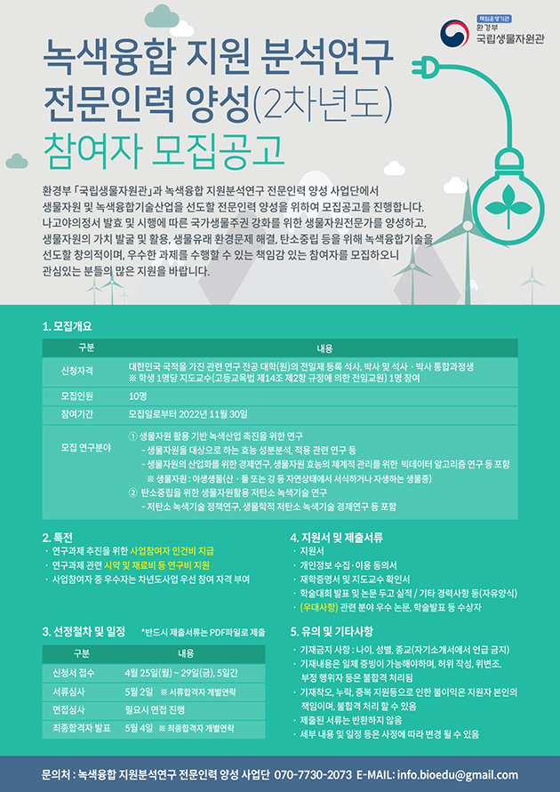 환경부 국립생물자원관 녹색융합 지원분석연구 전문인력양성 참여자 모집 안내