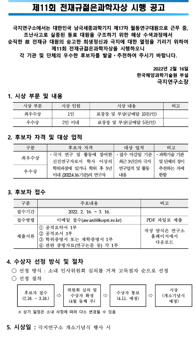 제11회 전재규젊은과학자상 수상후보자 시행 공고