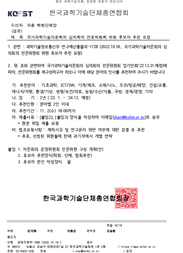 국가과학기술자문회의 심의회의 전문위원회 위원 후보자 추천