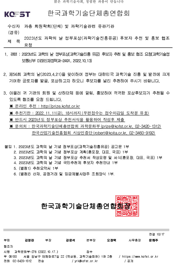[과총] 2023년도 과학의 날 정부포상(과학기술진흥유공) 후보자 추천