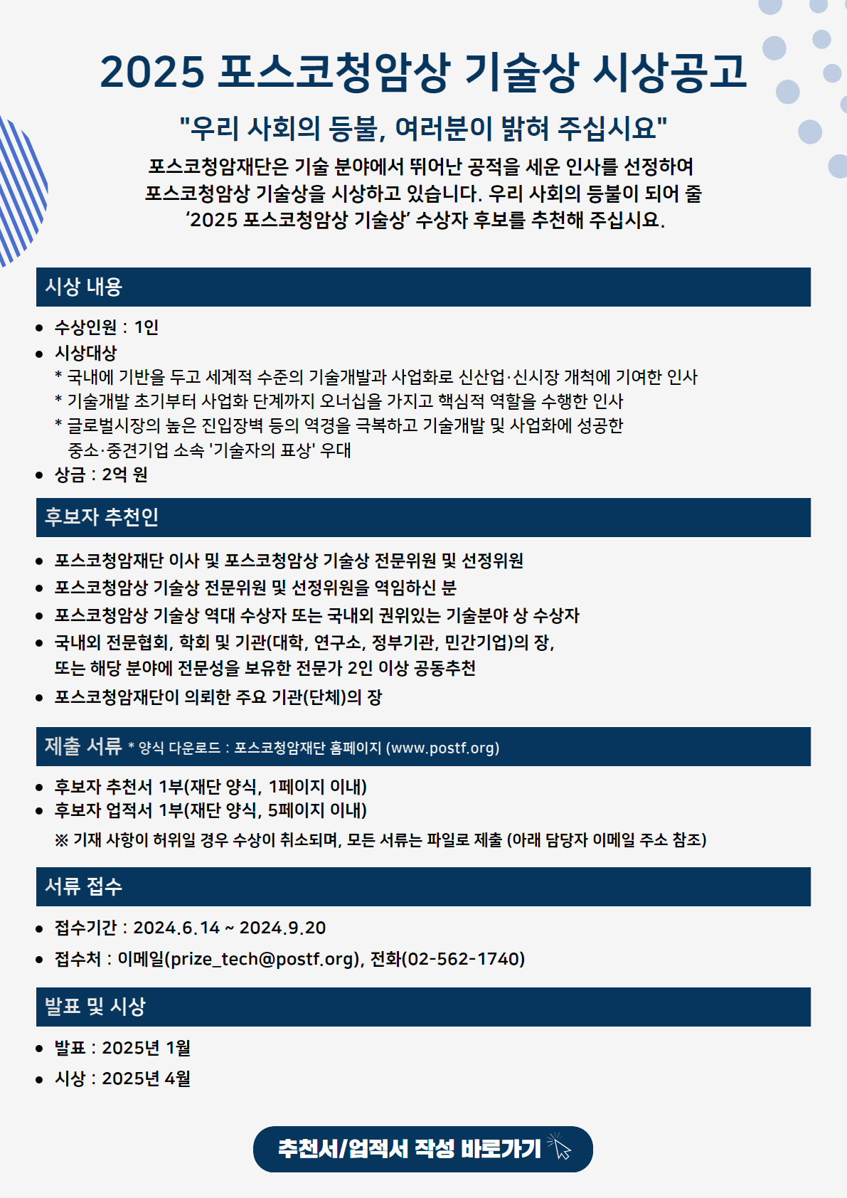 포스코청암상은 과학·교육·봉사·기술 총 4개 부문을 시상합니다.