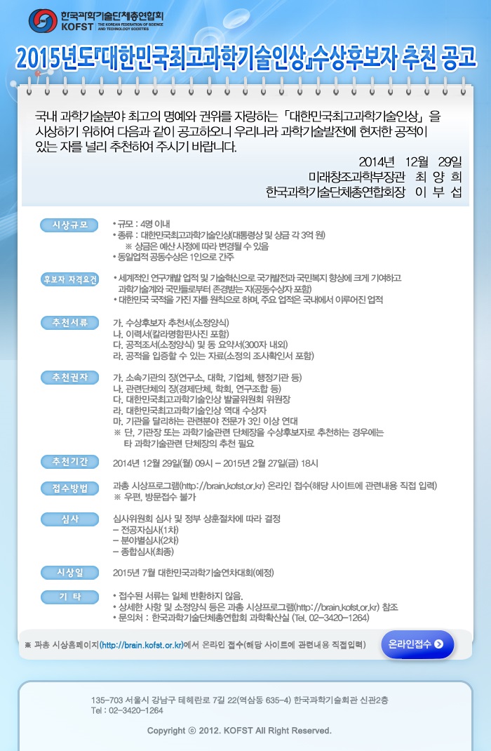 2015 대한민국최고과학기술인상 수상 후보자 추천의뢰