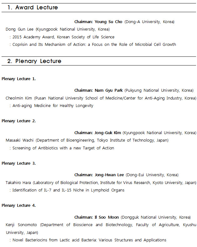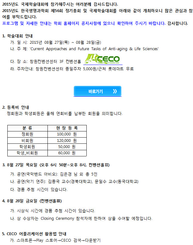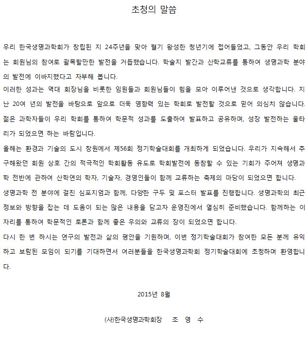 (사)한국생명과학회- 2015년도 제56회 정기총회 및 국제학술대회 (8/27~8/28) 안내