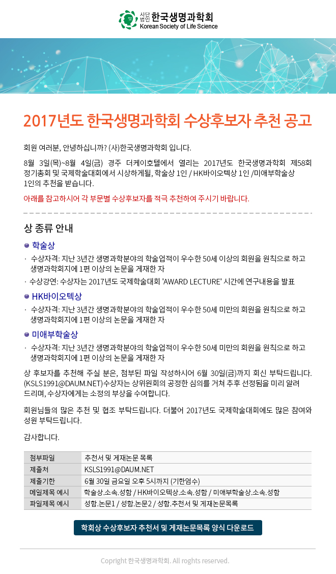 한국생명과학회 학술상 등 수상후보자 추천공고(~6/30까지 기한엄수)