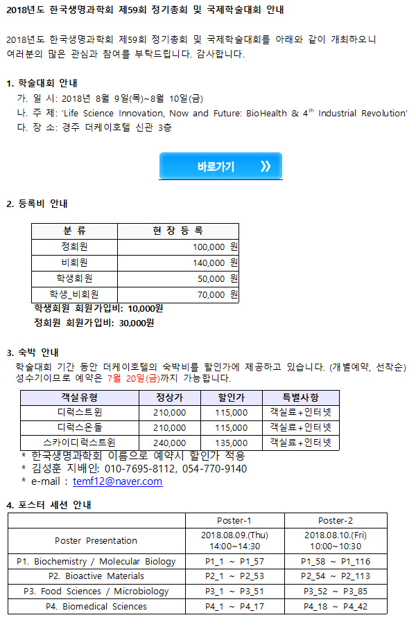 (초록집, 포스터게시요령첨부)2018년도 한국생명과학회 제59회 정기총회 및 국제학술대회 안내