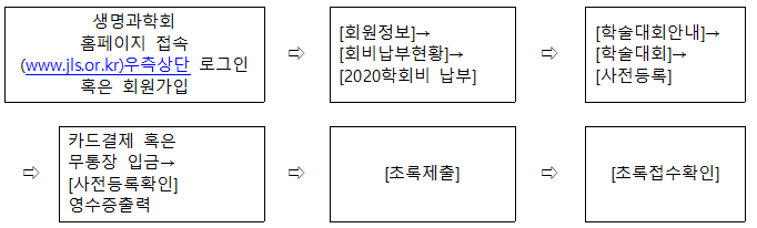 - 발표논문 초록은 MS 워드파일을 사용하여 제목, 저자, 소속, 초록, Key words를 모두 영문으로 작성한 후, 학회 홈페이지(www.jls.or.kr)에서 사전등록후, 제출한다.