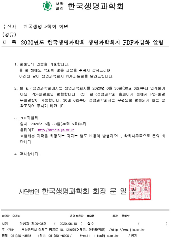 2020년도 한국생명과학회 생명과학회지 PDF파일화 알림