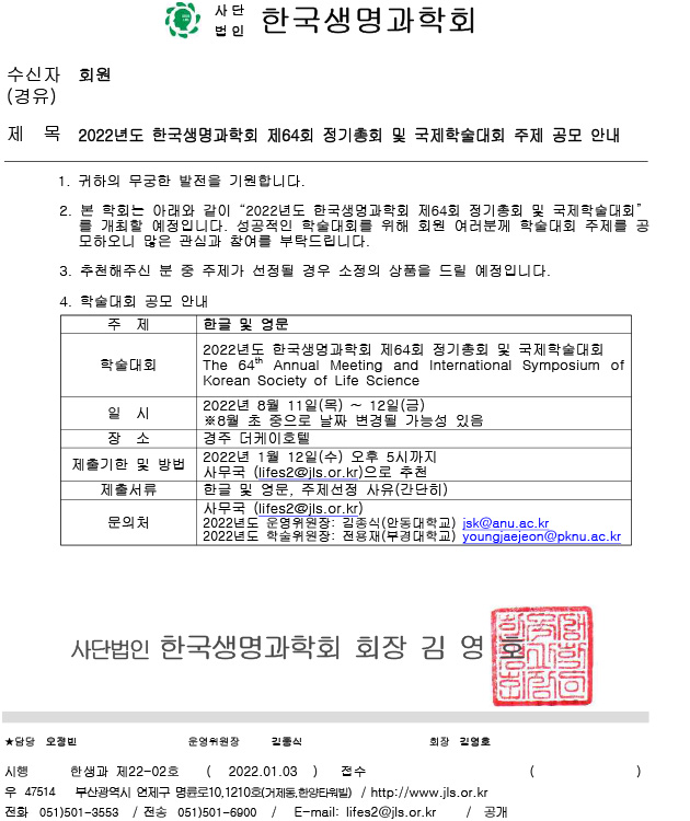 주제 공모 안내- 2022년도 한국생명과학회 제64회 정기총회 및 국제학술대회