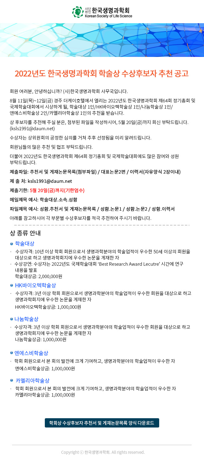 2022년도 한국생명과학회 학술상 수상후보자 추천 공고