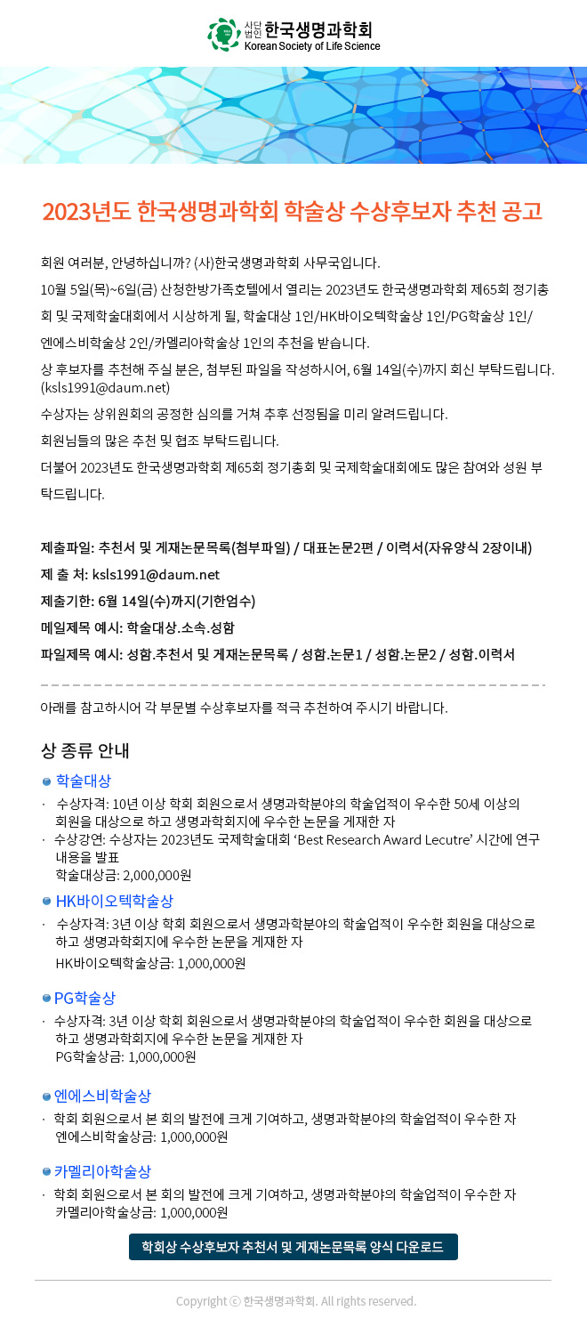 2023년도 한국생명과학회 학술상 수상후보자 추천 공고(6/14까지)