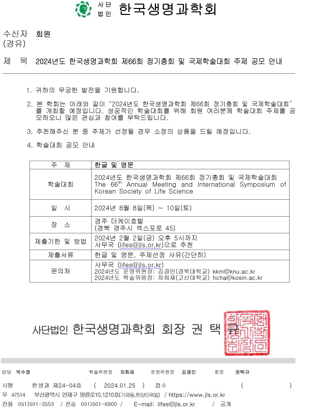 2024년도 한국생명과학회 제66회 정기총회 및 국제학술대회 주제 공모 안내