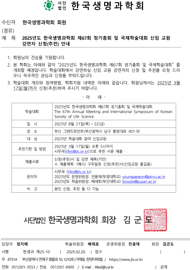 2025년도 한국생명과학회 제67회 정기총회 및 국제학술대회 신임 교원 강연자 신청(추천) 안내