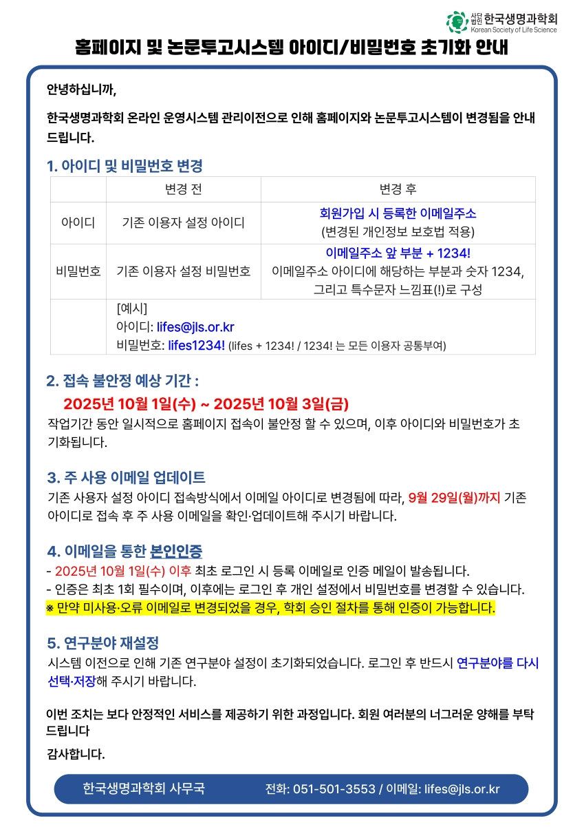 [중요] 홈페이지 및 논문투고시스템 아이디/비밀번호 초기화 안내