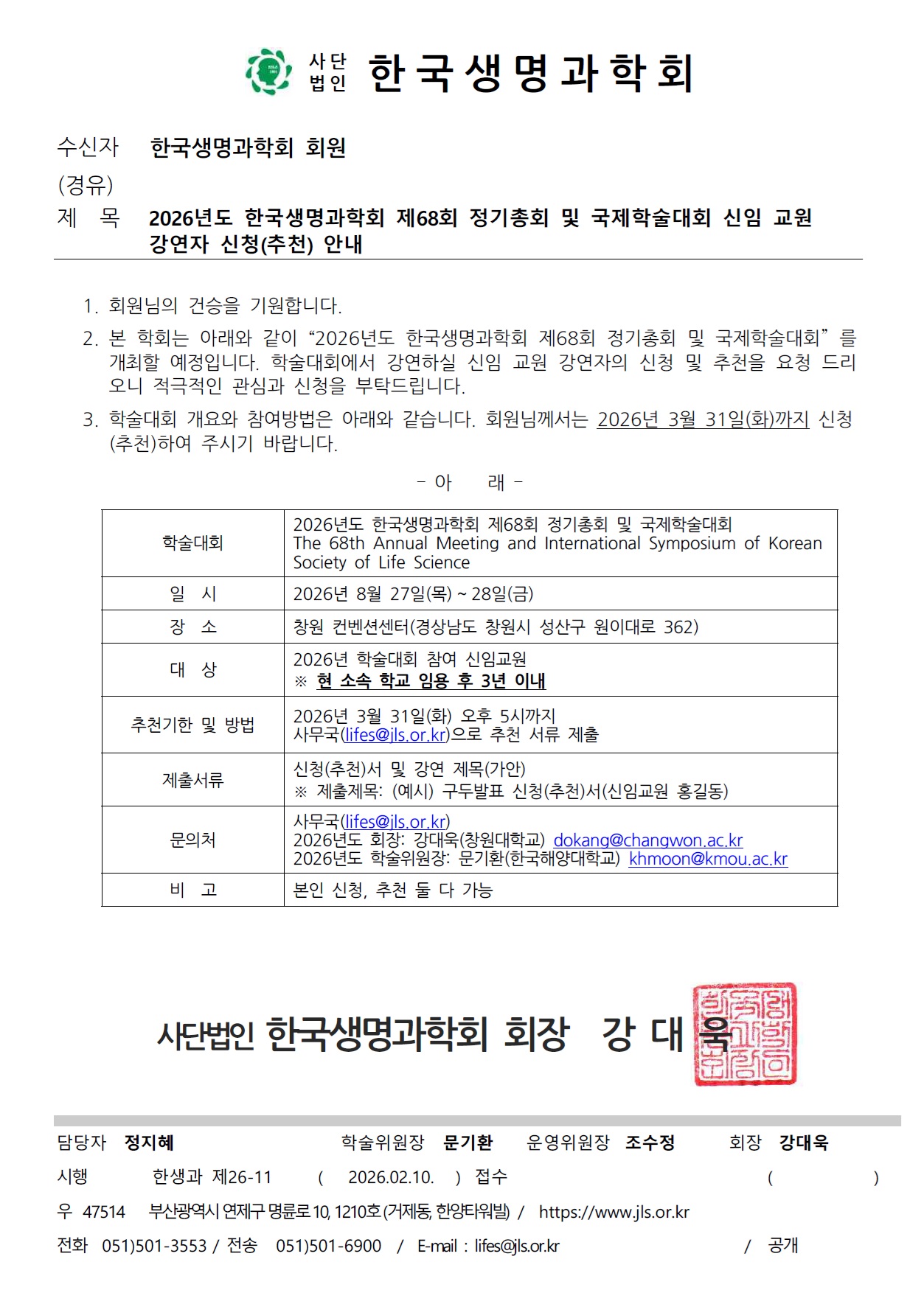 한생과 제26-11호_2026년도 한국생명과학회 제68회 정기총회 및 국제학술대회 신임 교원 강연자 신청(추천) 안내.pdf